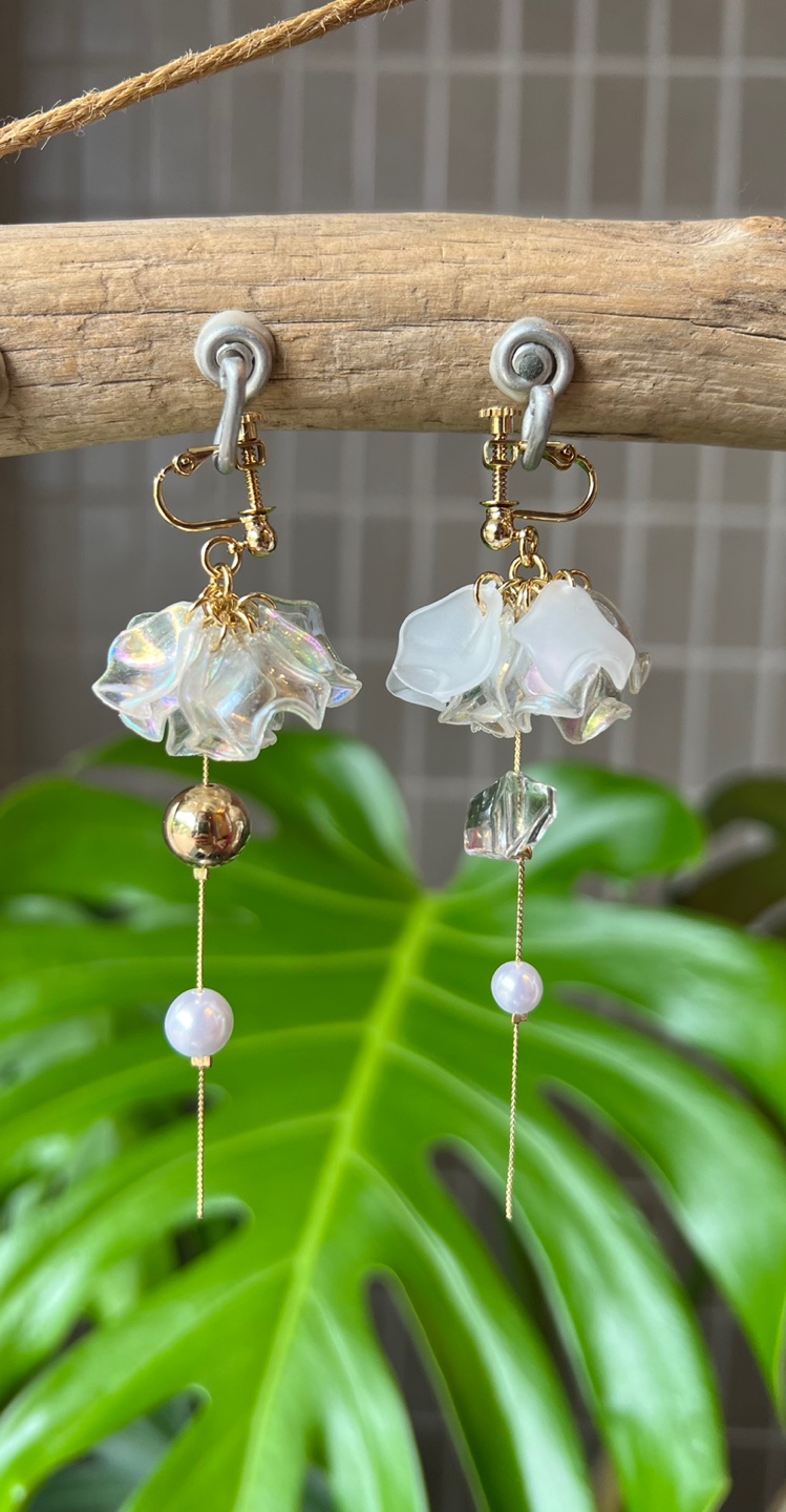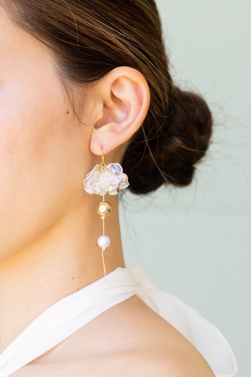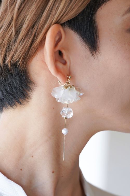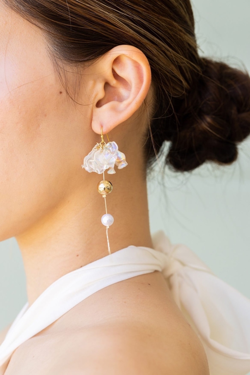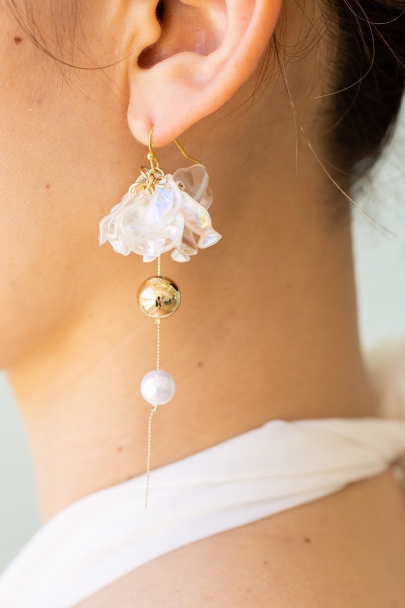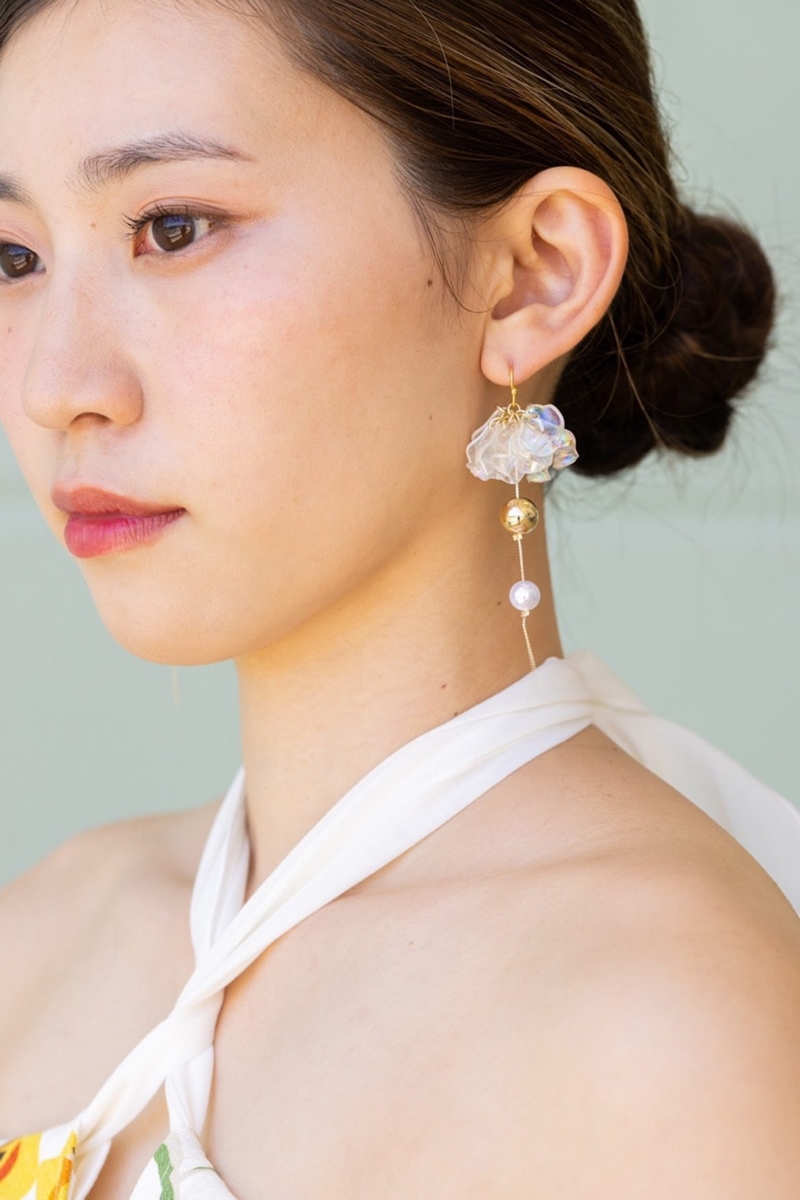 耳元で揺れる清涼感ある花びらがさわやかな印象の夏色ピアス