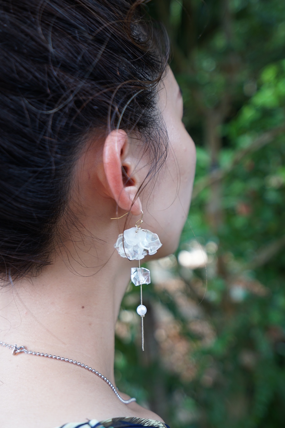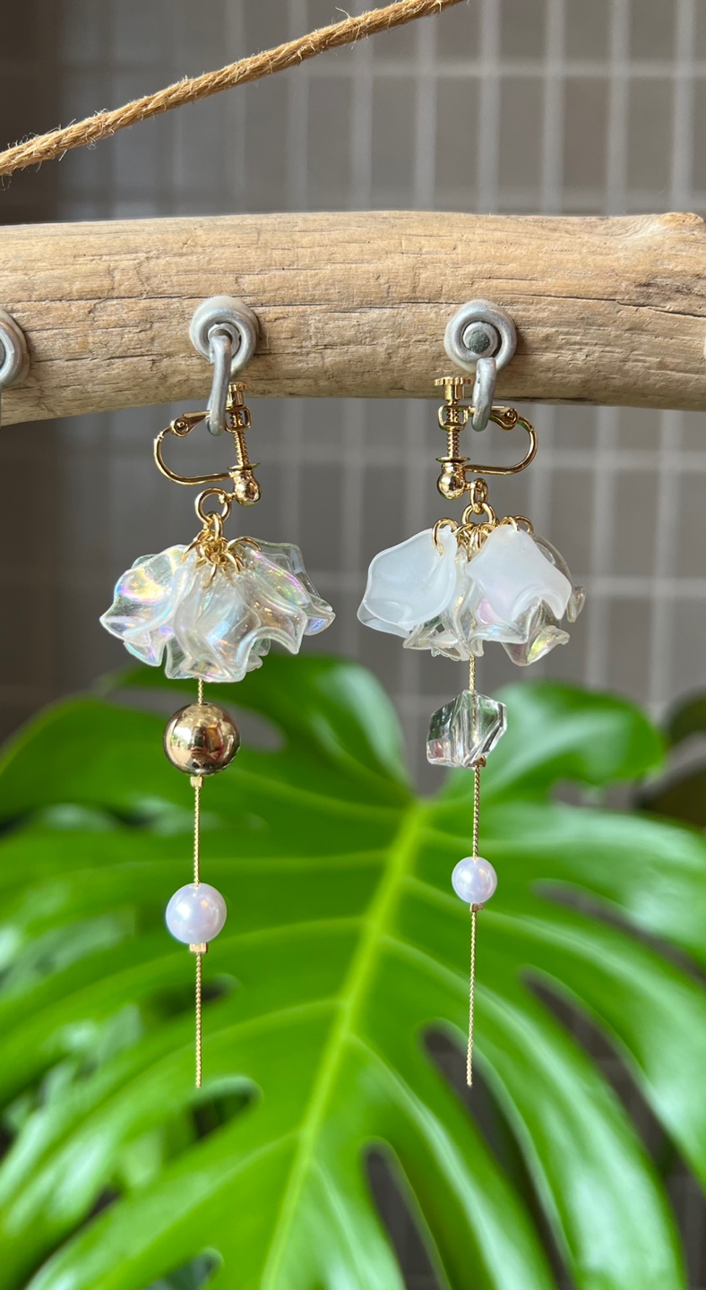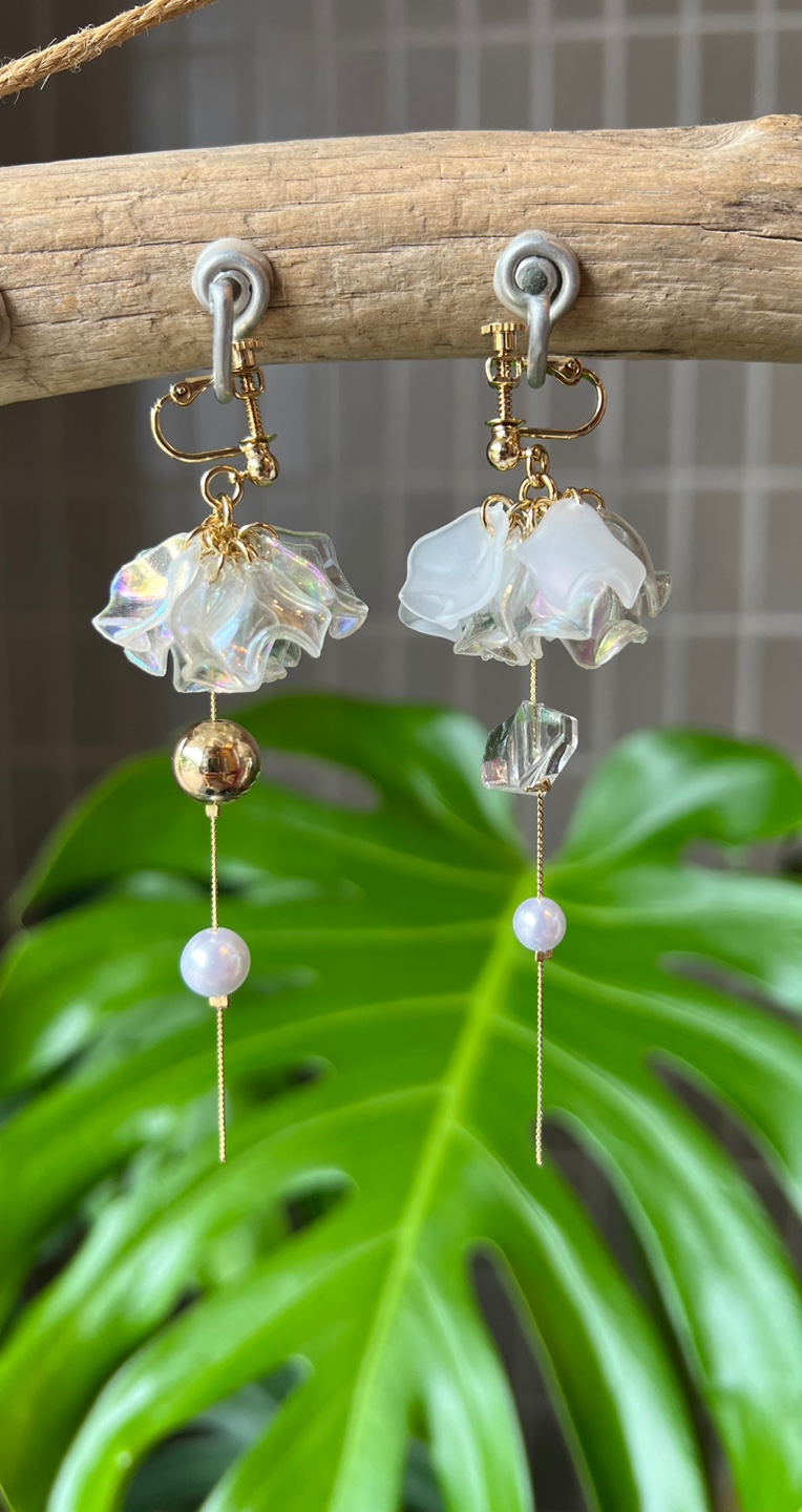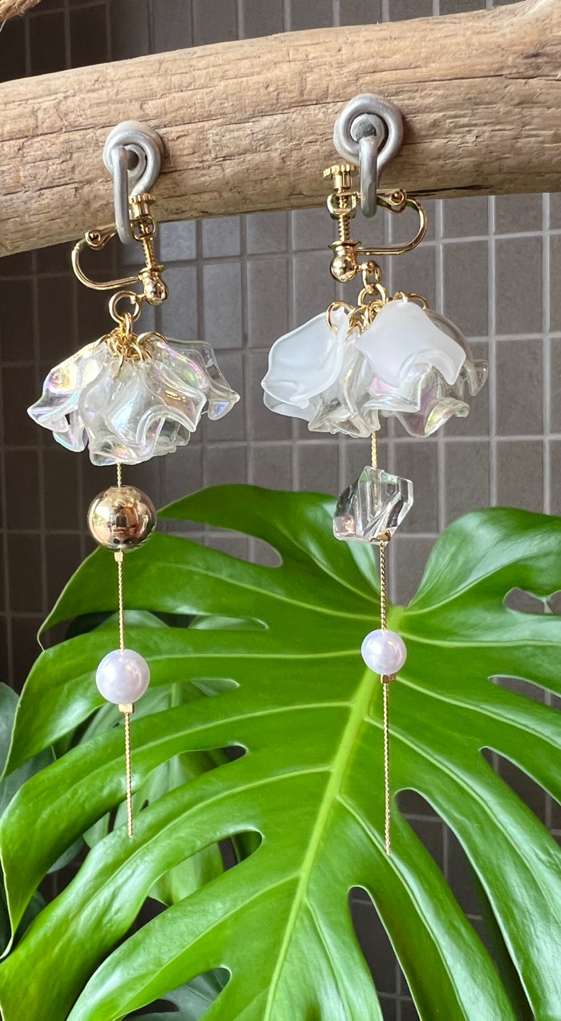 耳元で揺れる清涼感ある花びらがさわやかな印象の夏色ピアス